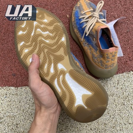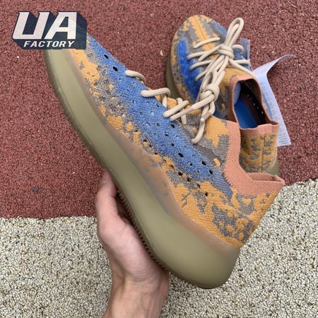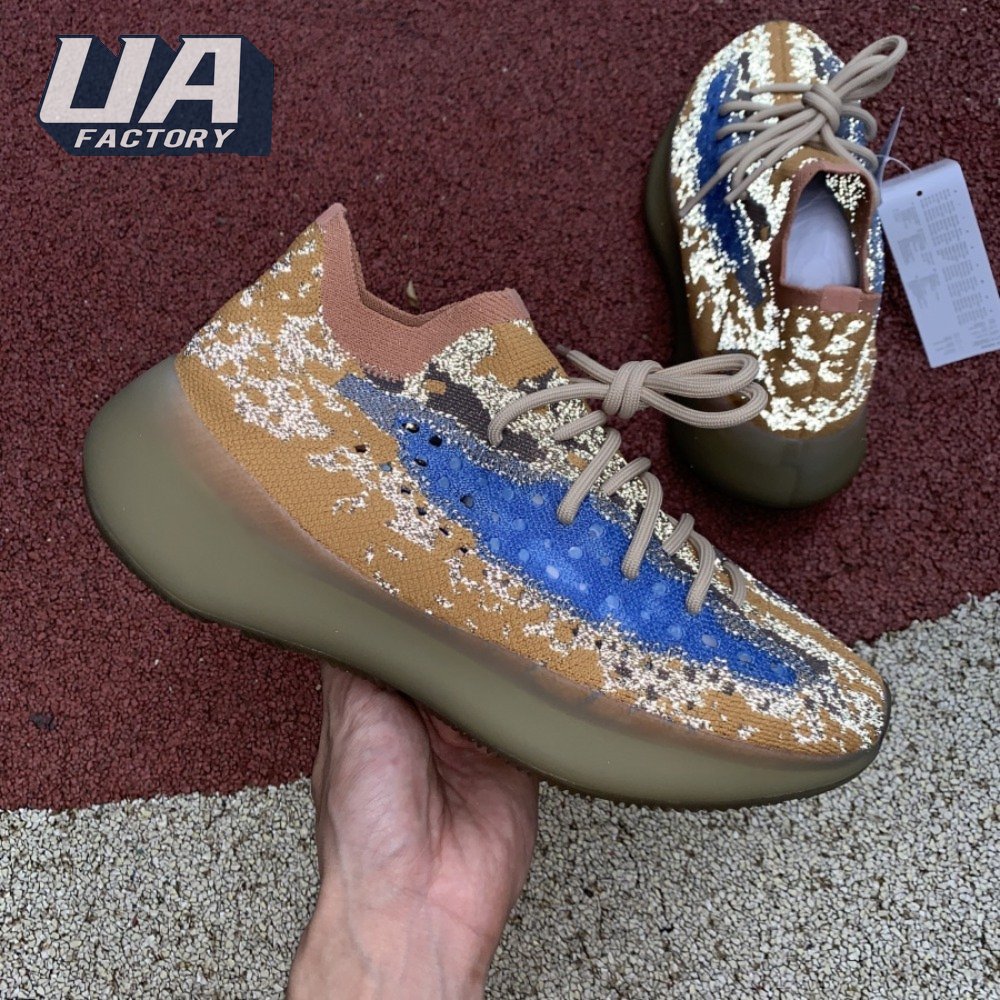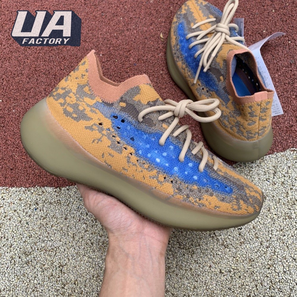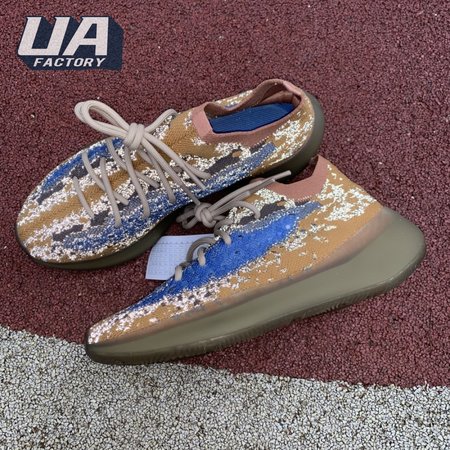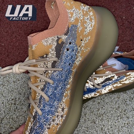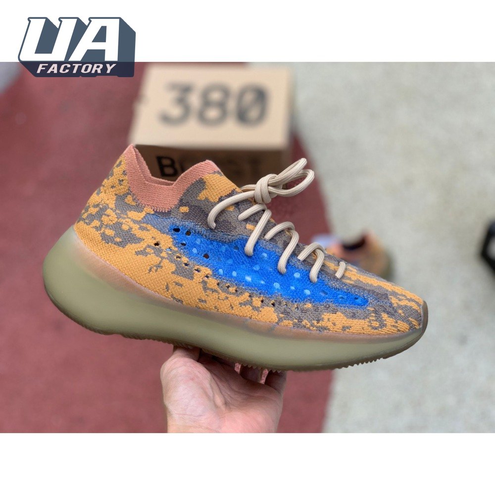 The adidas Yeezy Boost 380 "Blue Oat Reflective" makes use of a Primeknit upper in a blend of orange and brown hues, resulting in a unique camo-like pattern that"s enlivened with a contrasting pop of blue on the translucent monofilament window. Reflective thread is woven into the sock-like build, offering added visibility in low-light conditions. The responsive Boost midsole is encased in semi-translucent rubber and supported by a herringbone rubber outsole.