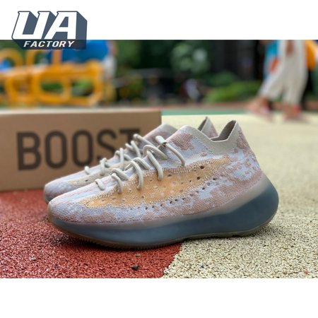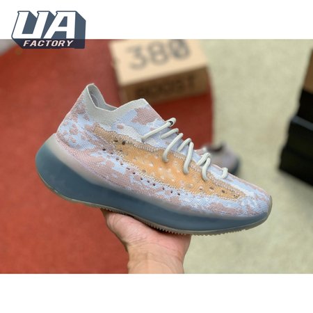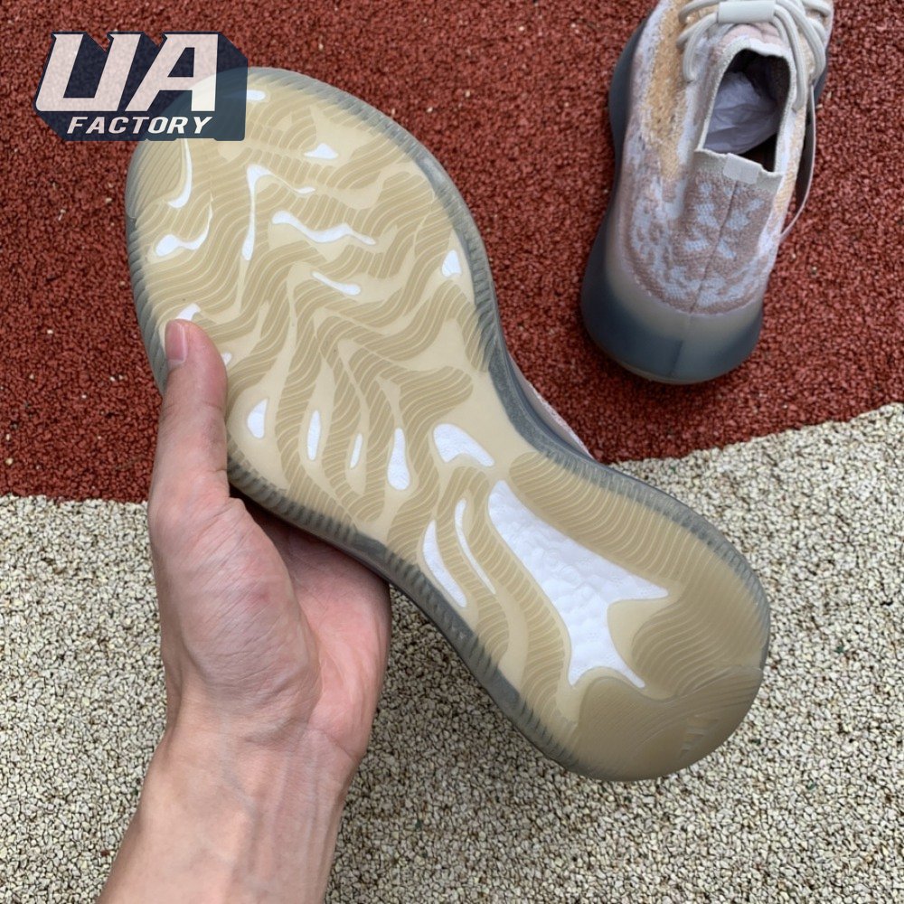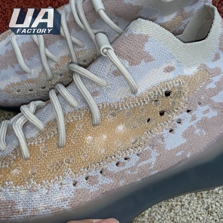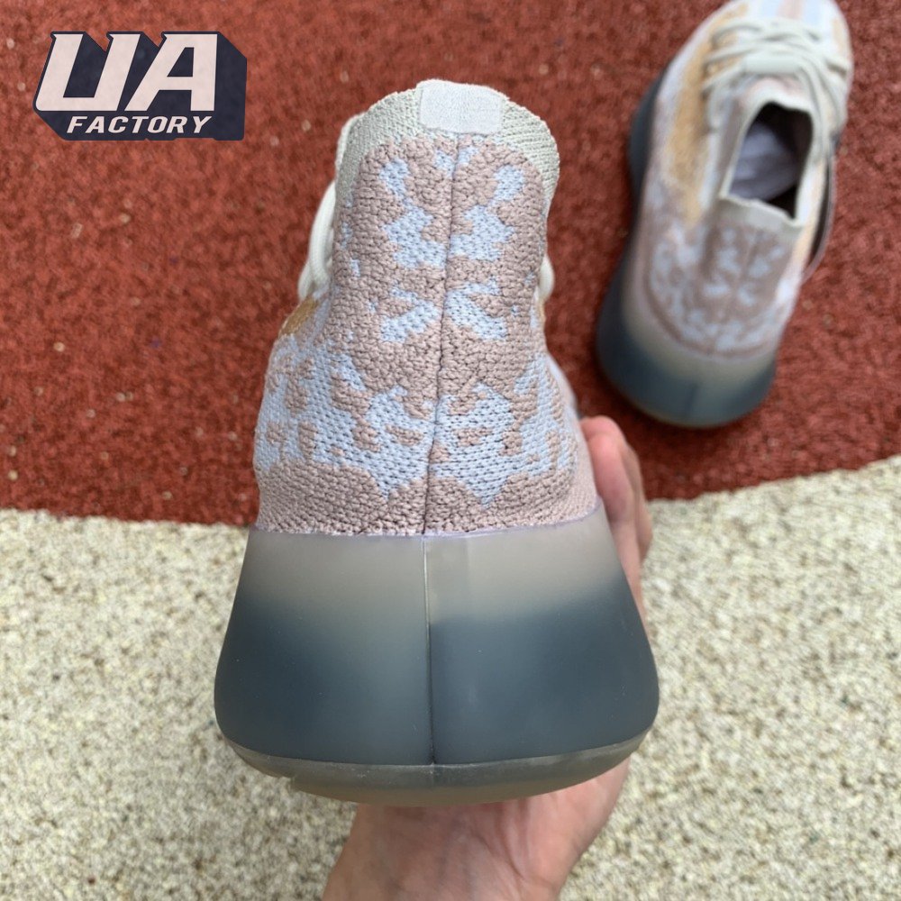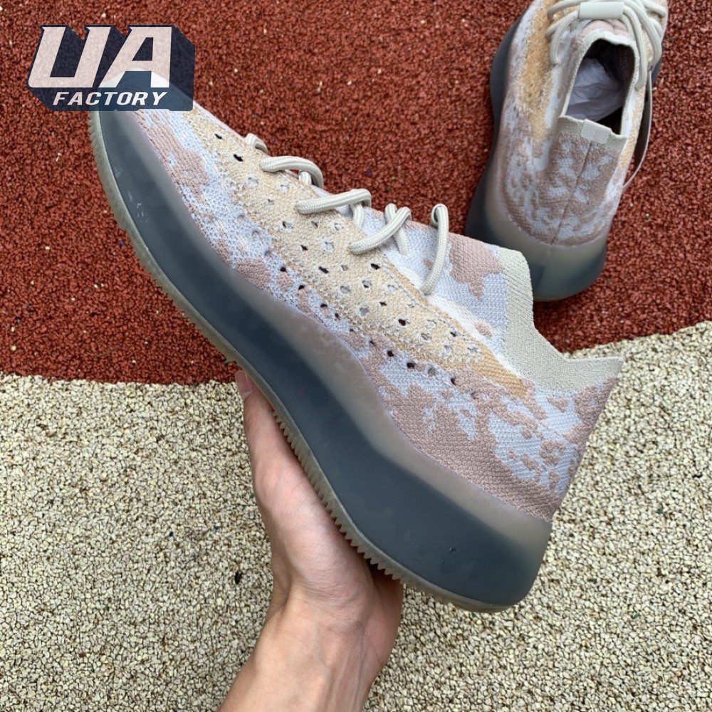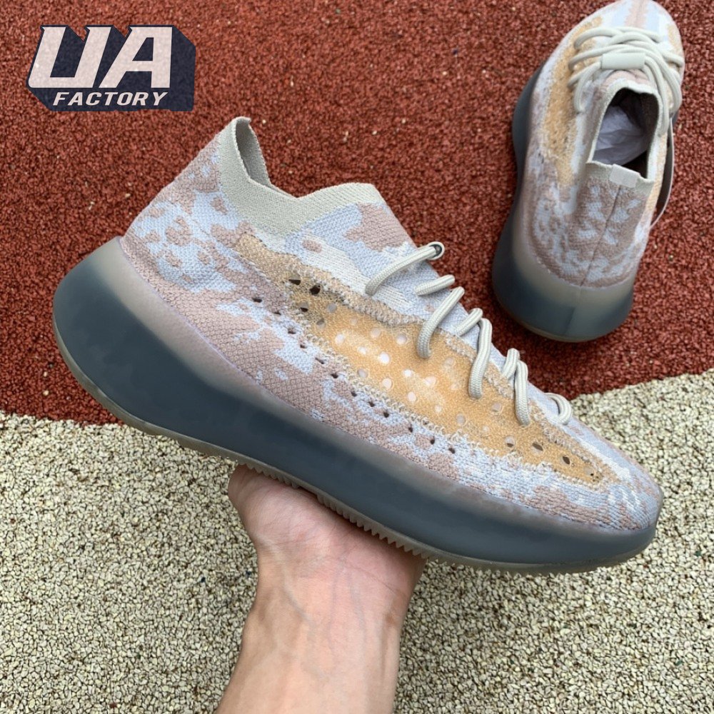 The adidas Yeezy Boost 380 "Pepper Reflective" offers sock-like comfort on the upper, crafted from subtly patterned Primeknit in a blend of light grey and beige hues. Reflective fibers are woven into the mix, offering enhanced visibility in low-light conditions. A coppery finish distinguishes the post-dyed monofilament side stripe, adding a see-through element to the minimalist build. A greyish-blue rubber cage envelops the full-length Boost midsole.