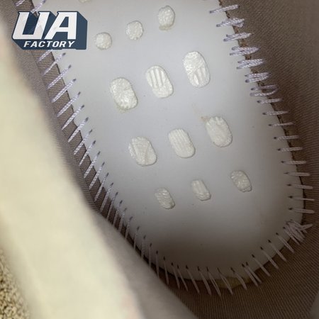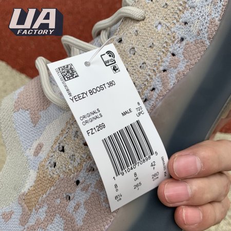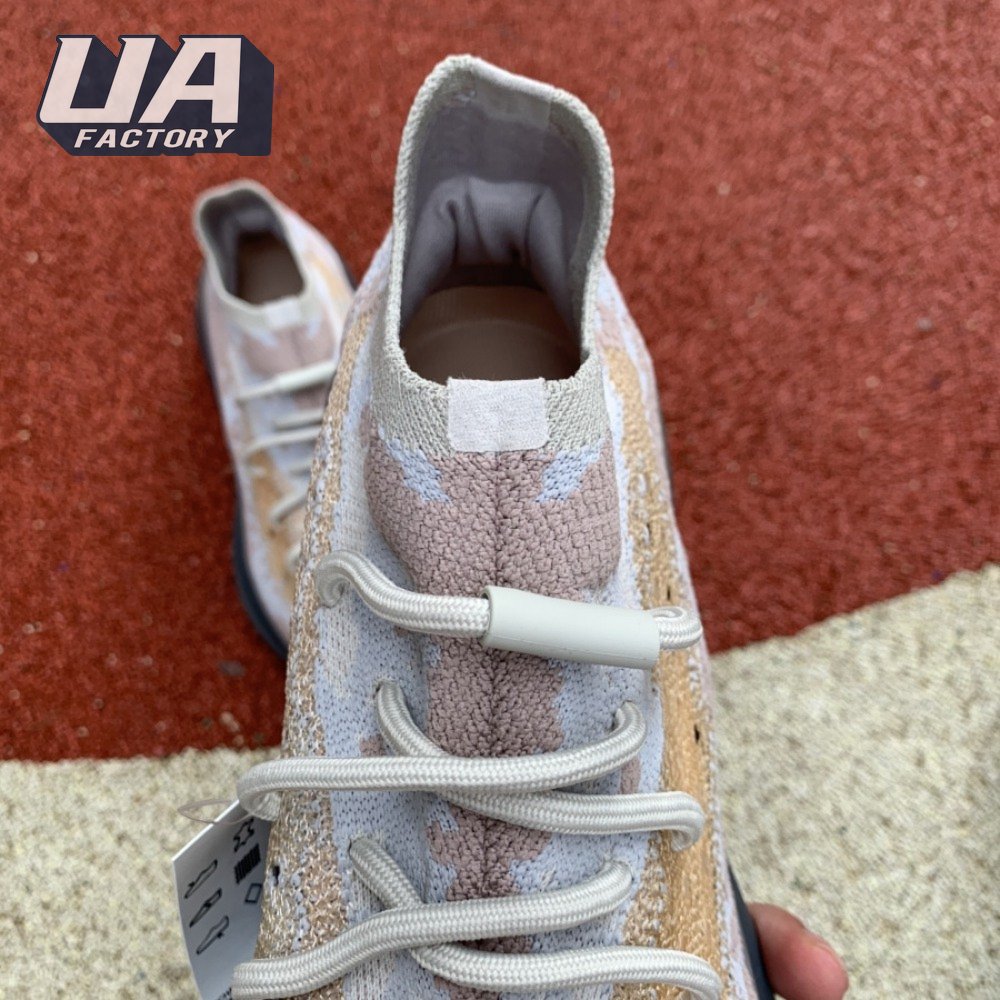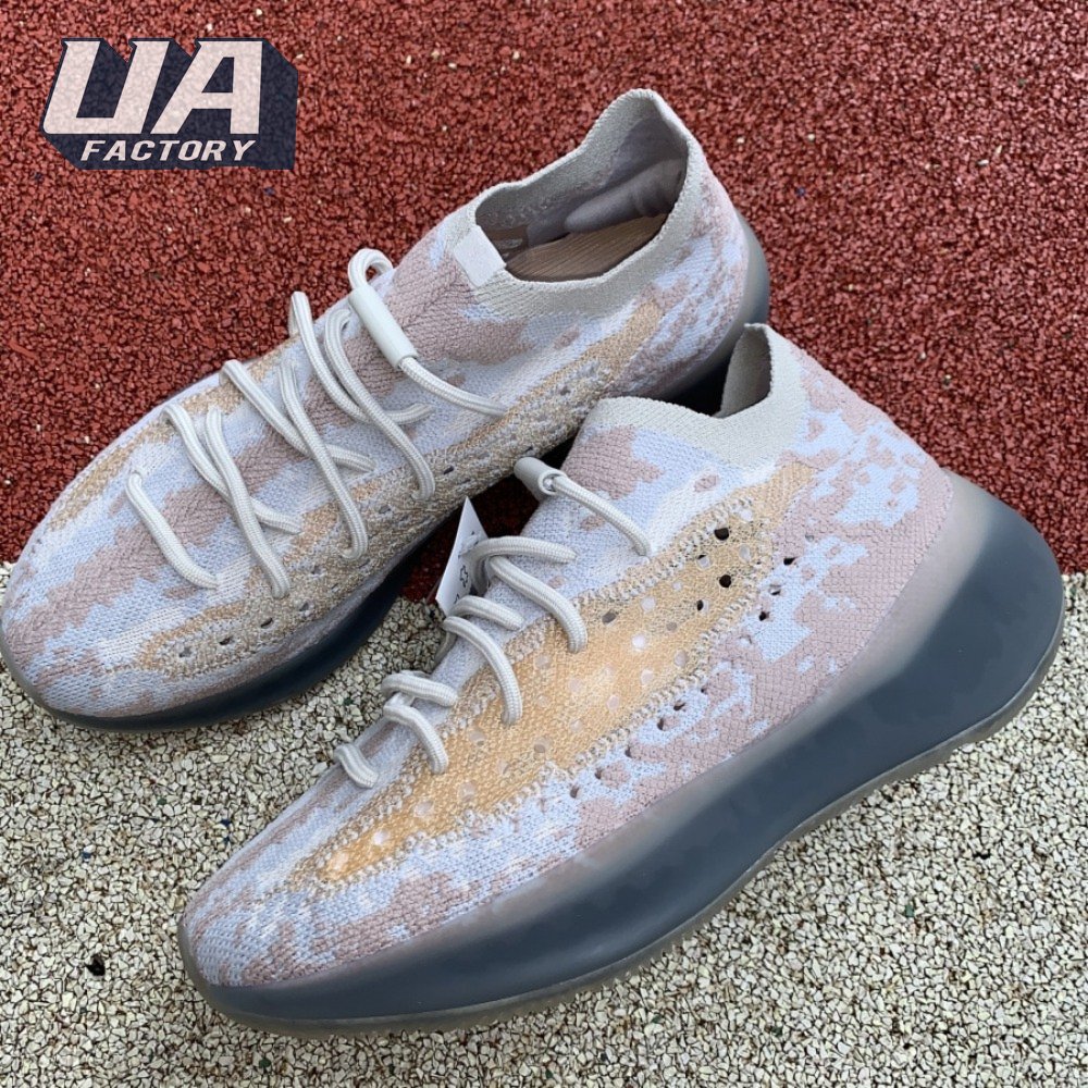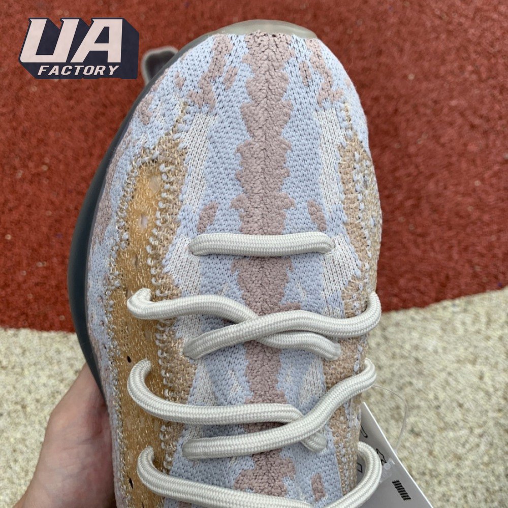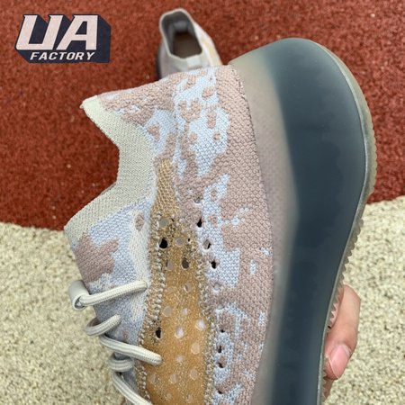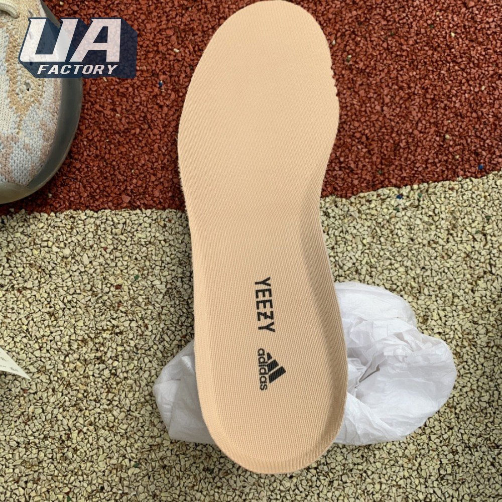 The adidas Yeezy Boost 380 "Pepper Reflective" offers sock-like comfort on the upper, crafted from subtly patterned Primeknit in a blend of light grey and beige hues. Reflective fibers are woven into the mix, offering enhanced visibility in low-light conditions. A coppery finish distinguishes the post-dyed monofilament side stripe, adding a see-through element to the minimalist build. A greyish-blue rubber cage envelops the full-length Boost midsole.