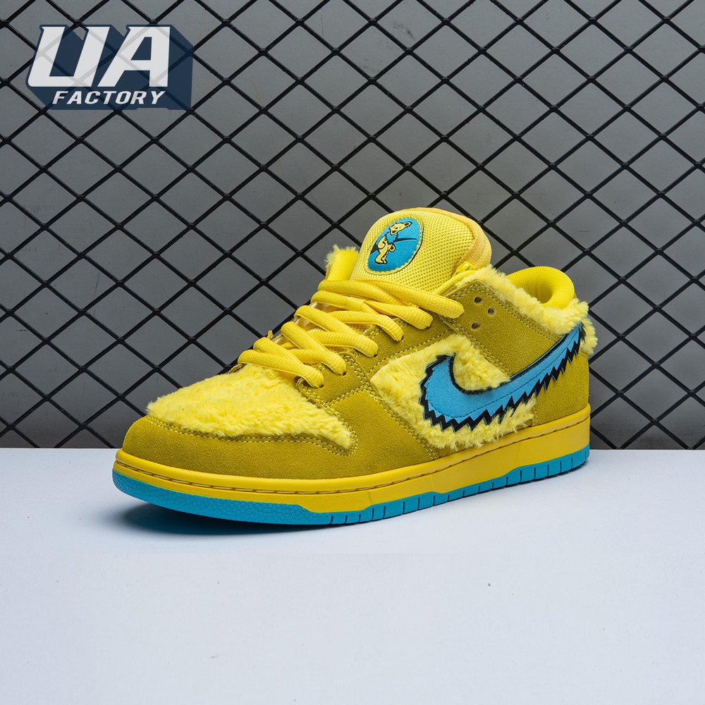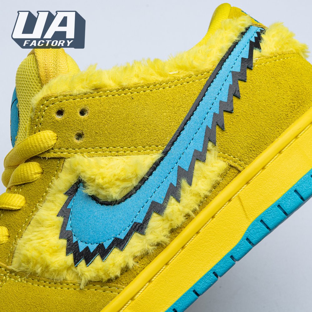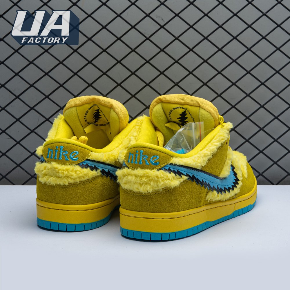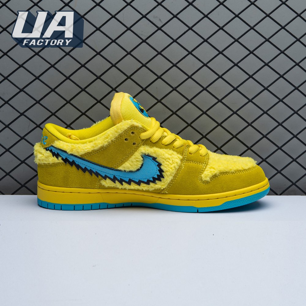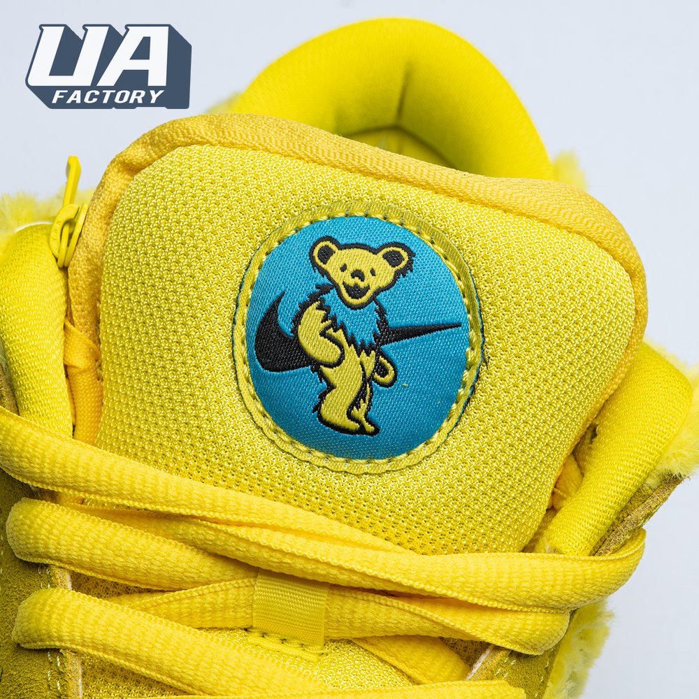Developed in collaboration with the iconic San Francisco jam band, the Grateful Dead x Nike Dunk Low SB "Yellow Bear" features a unique design inspired by the back cover of "History of the Grateful Dead, Volume One (Bear"s Choice)," a live album originally released in 1973. A vibrant yellow finish is applied to the furry upper, fortified with tonal suede overlays and mounted atop a matching yellow foam midsole. Contrasting blue hits appear on the jagged Swoosh, rubber outsole and tongue, the latter furnished with a hidden stash pocket.