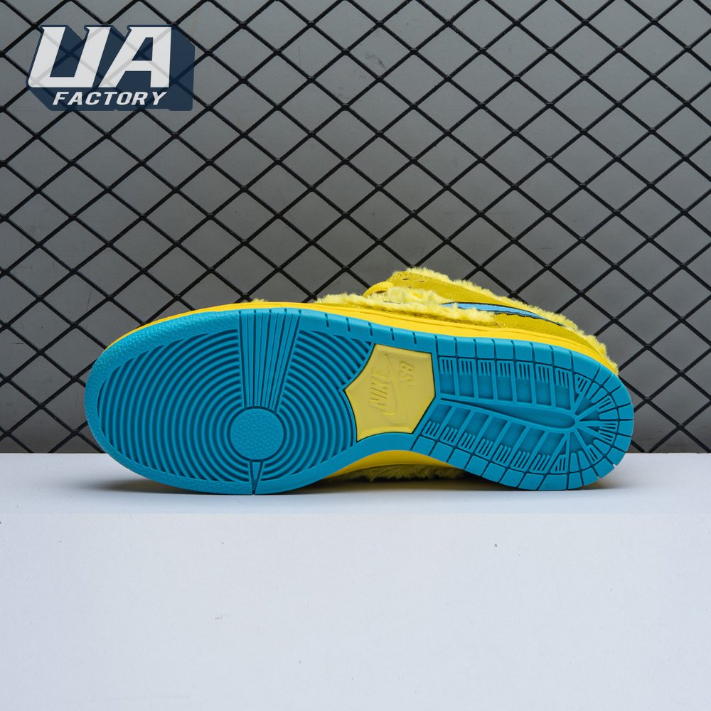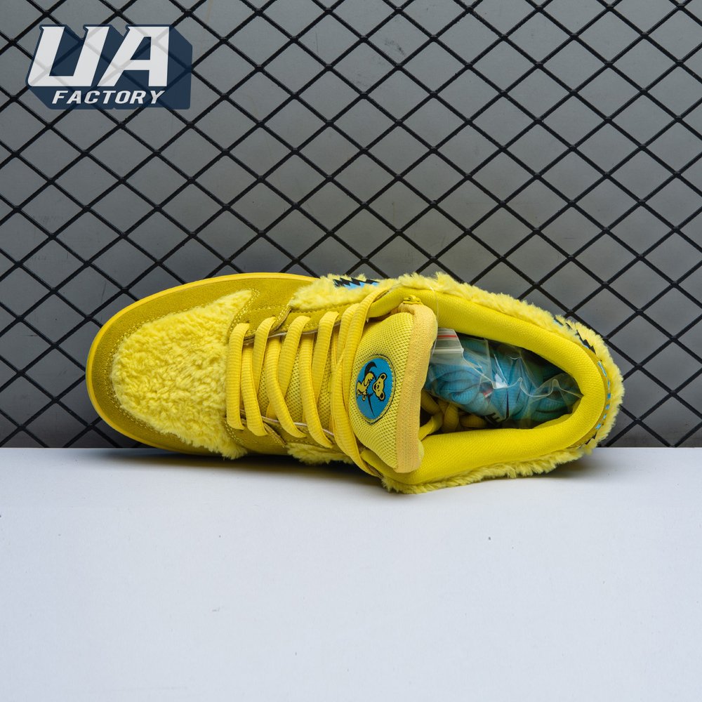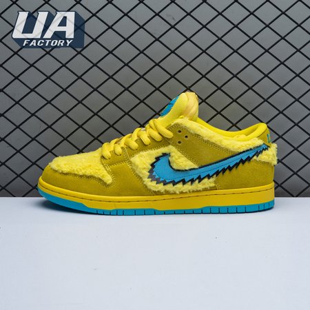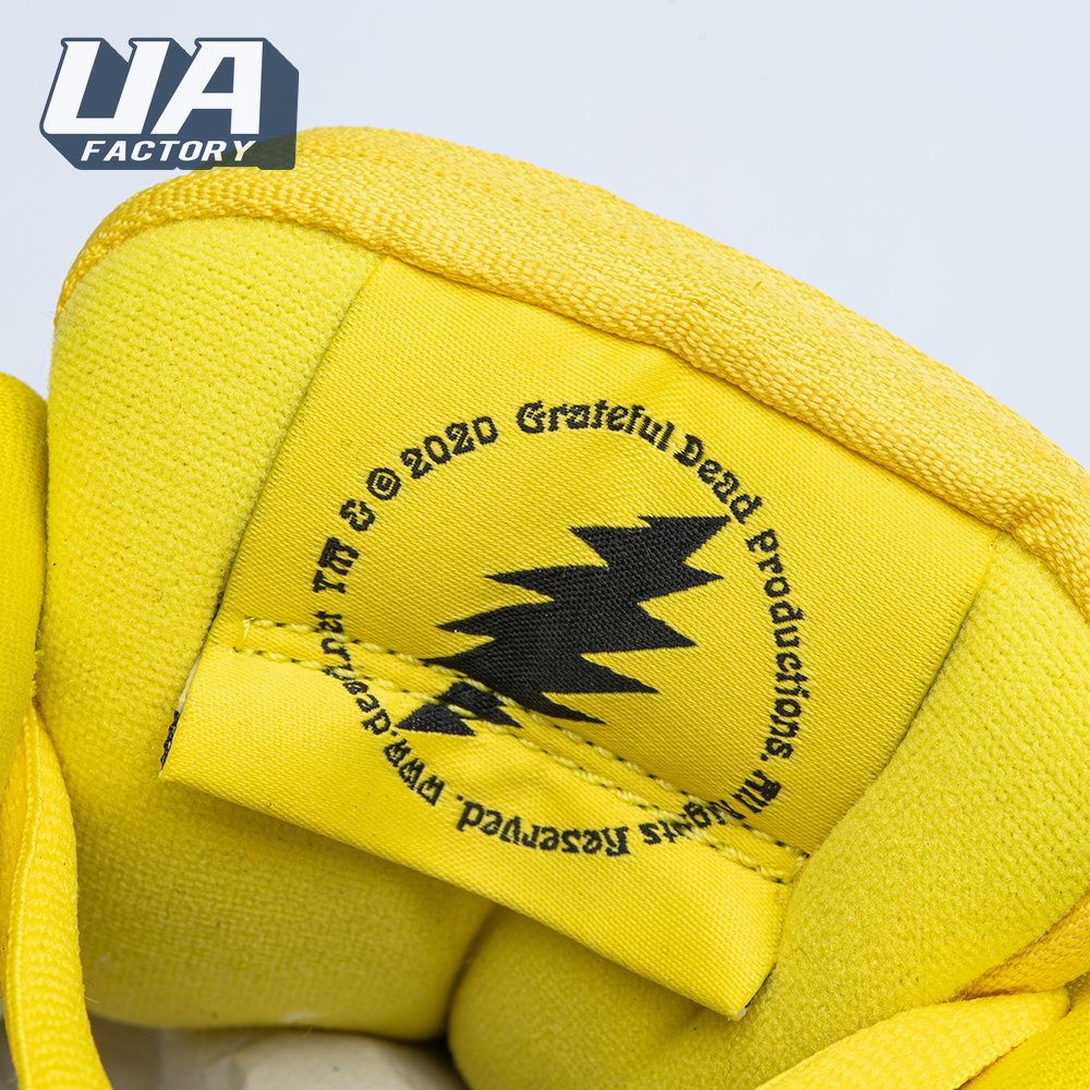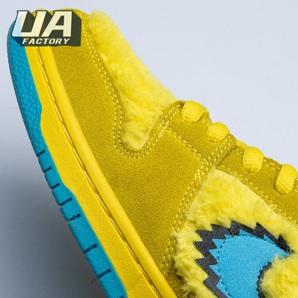 Developed in collaboration with the iconic San Francisco jam band, the Grateful Dead x Nike Dunk Low SB "Yellow Bear" features a unique design inspired by the back cover of "History of the Grateful Dead, Volume One (Bear"s Choice)," a live album originally released in 1973. A vibrant yellow finish is applied to the furry upper, fortified with tonal suede overlays and mounted atop a matching yellow foam midsole. Contrasting blue hits appear on the jagged Swoosh, rubber outsole and tongue, the latter furnished with a hidden stash pocket.