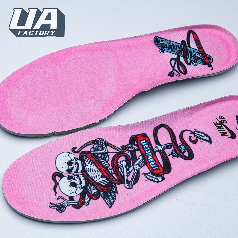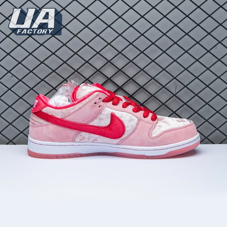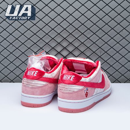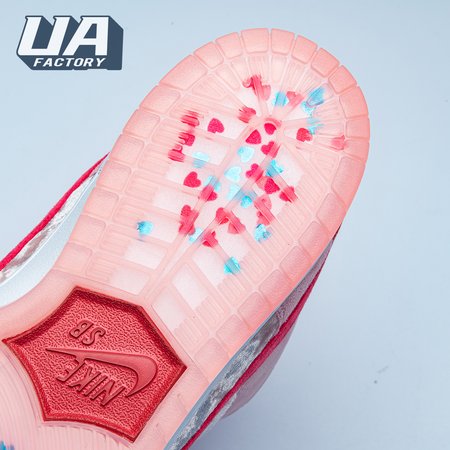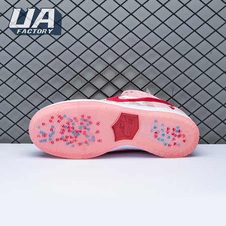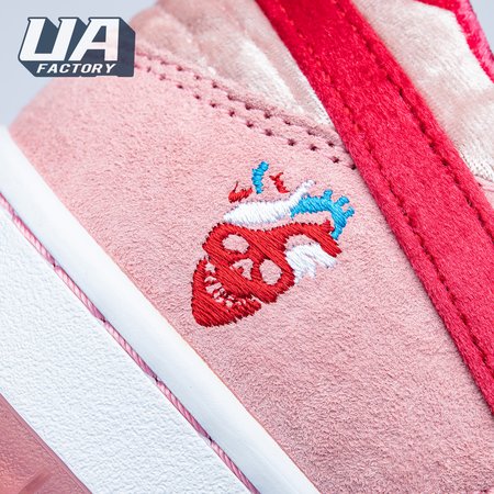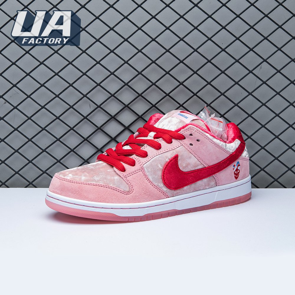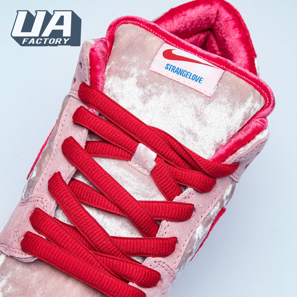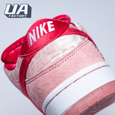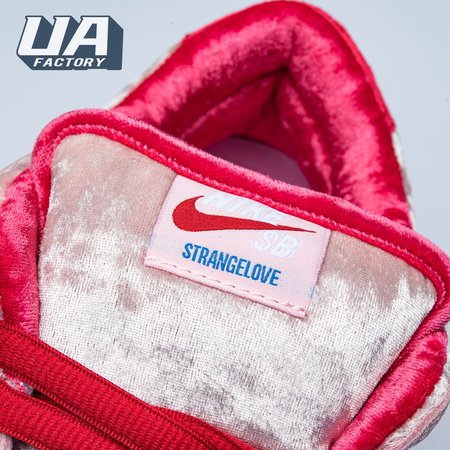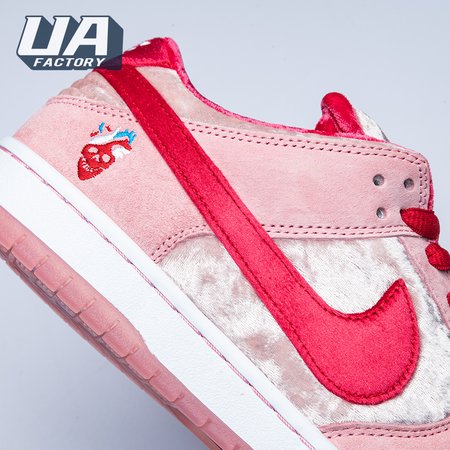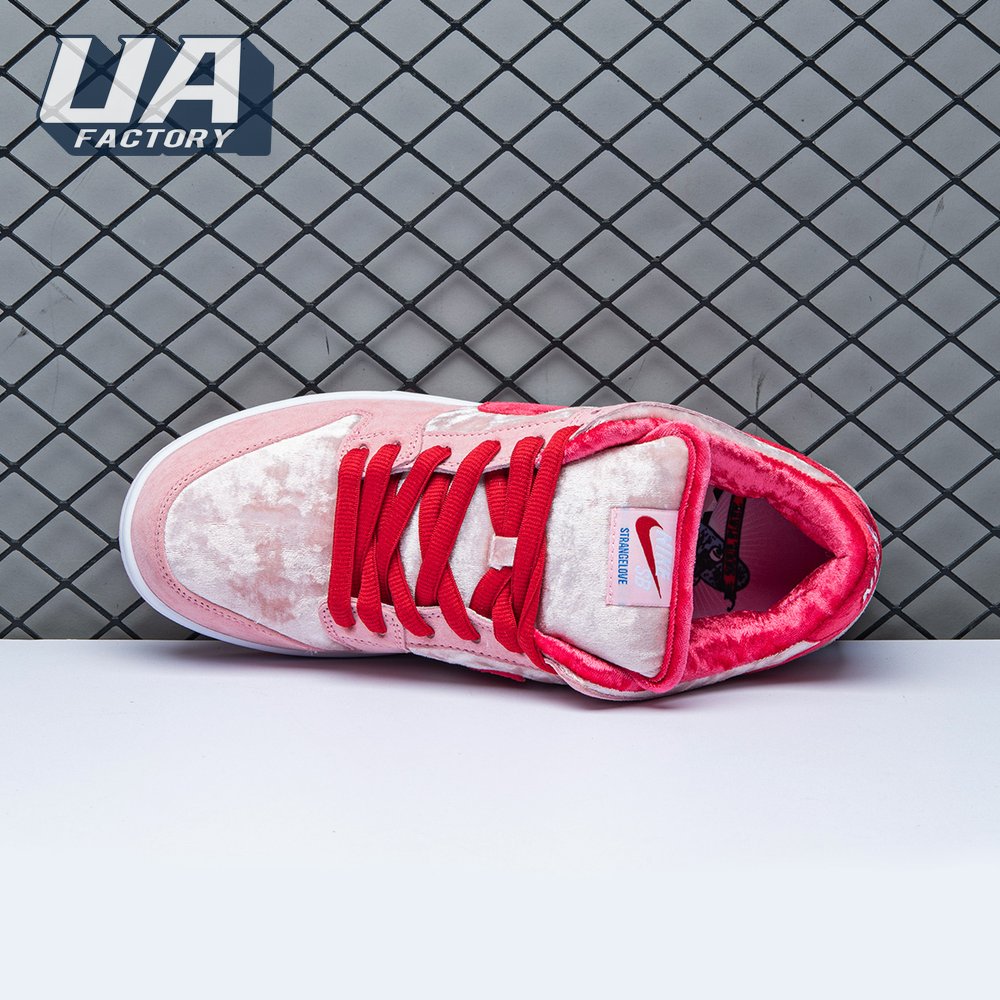 Made in collaboration with Sean Cliver"s skate brand, the StrangeLove x Dunk Low SB QS 'Valentine's Day' celebrates the romantic holiday with a plush take on the retro silhouette. The upper is constructed from white crushed velvet with pink suede overlays and a red velvet Swoosh. Cliver"s "Heart Skull" graphic is embroidered on the lateral heel, while the translucent pink rubber outsole reveals an array of scattered hearts in contrasting red and blue tones.