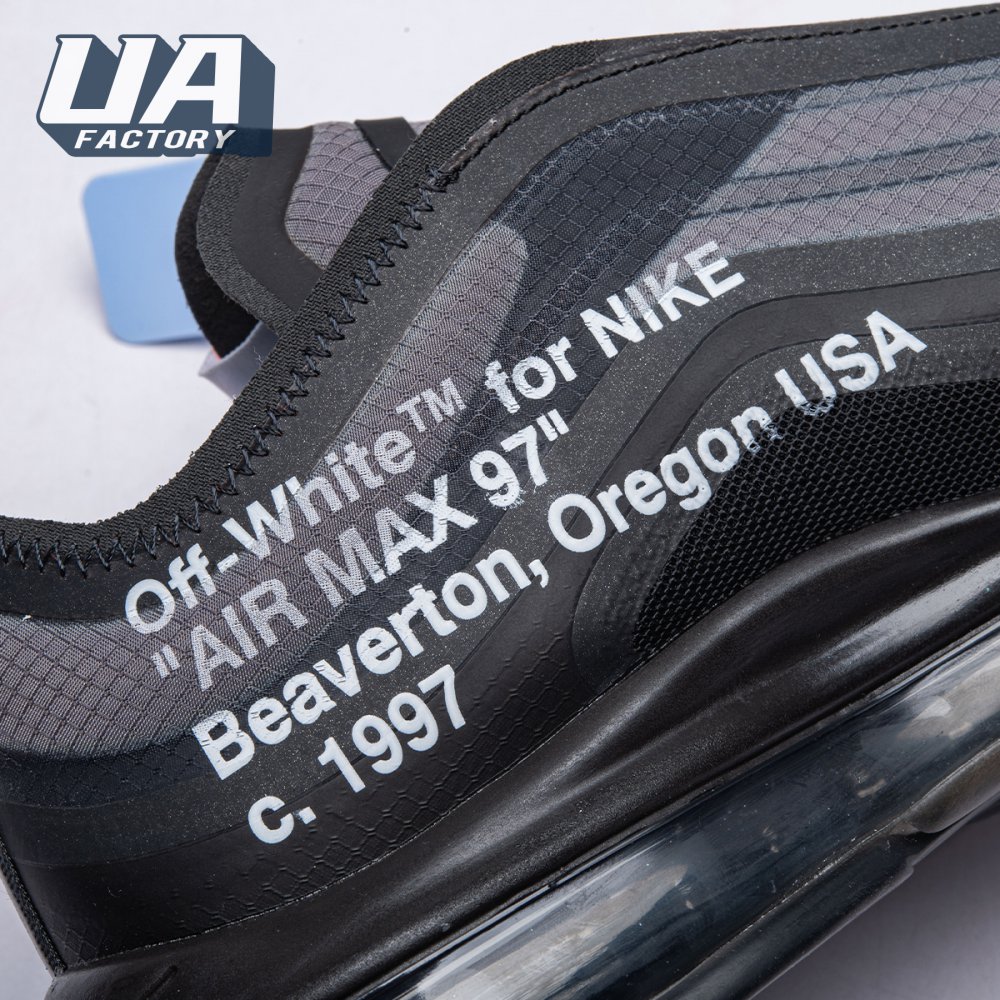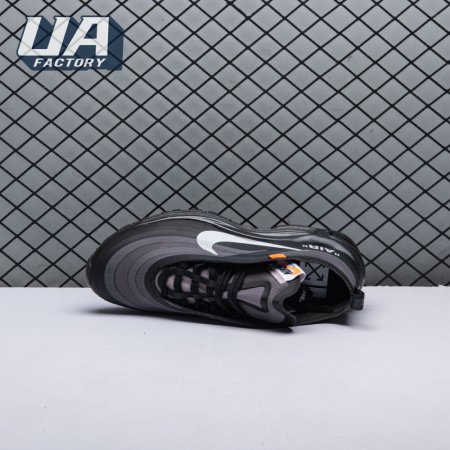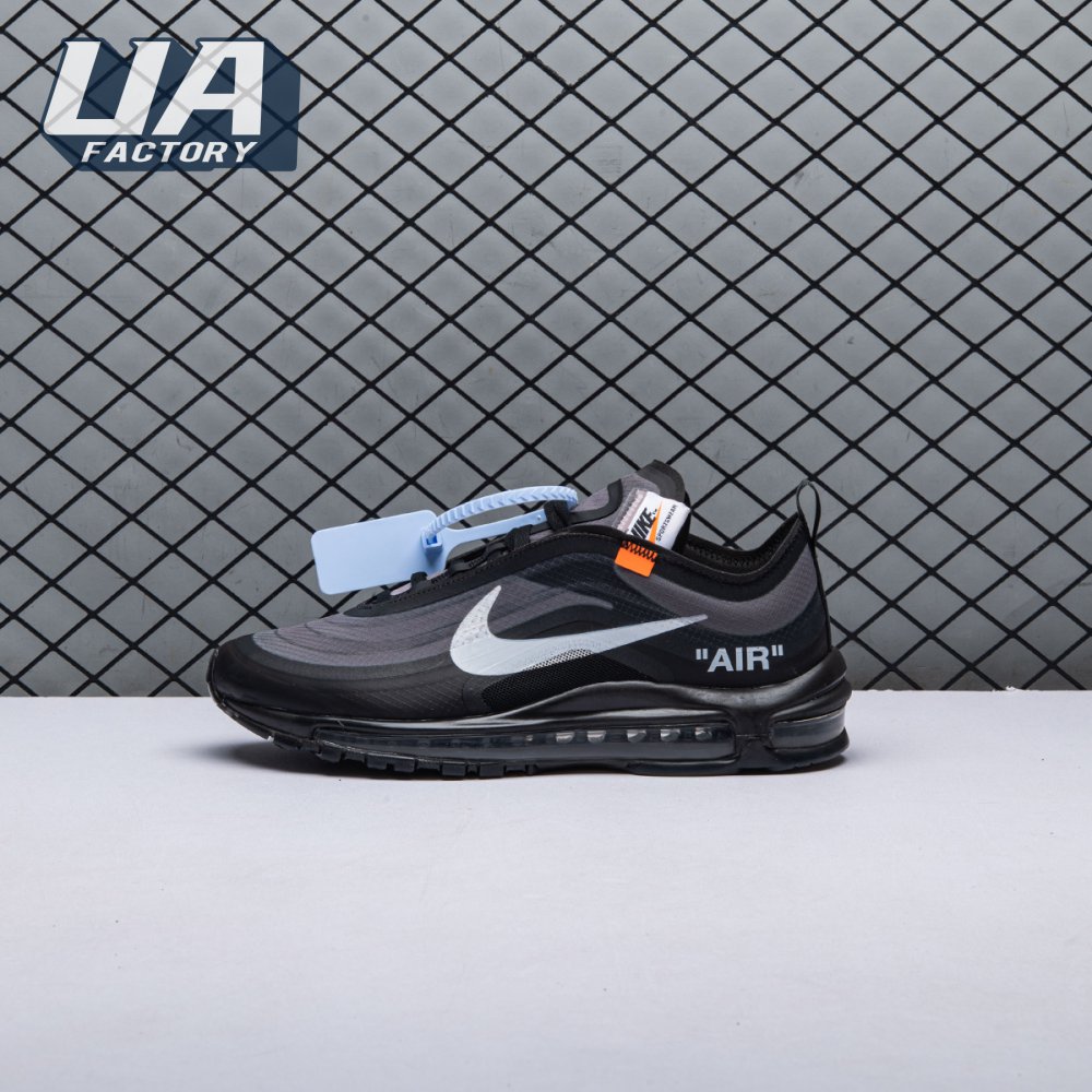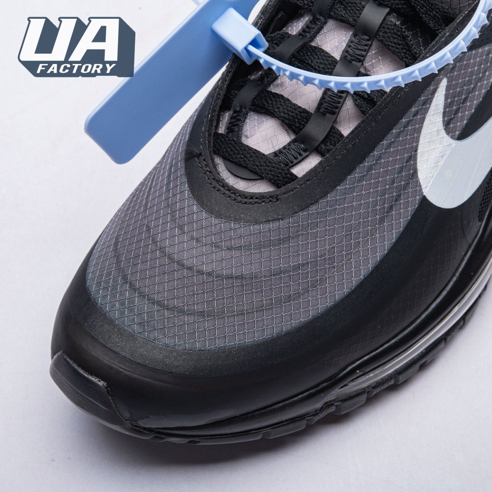Debuting on the runway at Paris Fashion Week in June 2018, the Off-White x Air Max 97 in black sees Virgil Abloh outfit the retro runner with a translucent textile upper. A white Swoosh and "AIR" lettering adorn the lateral side, while the quarter panel on the medial side is printed with more lines of Virgil"s signature text. The shoe"s reconstructed look is finished with a woven Nike tongue tag pushed to the side.
