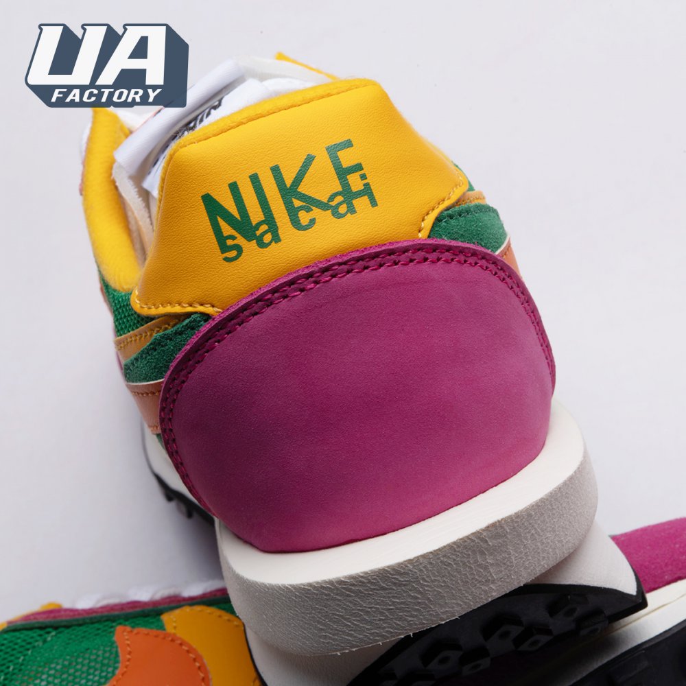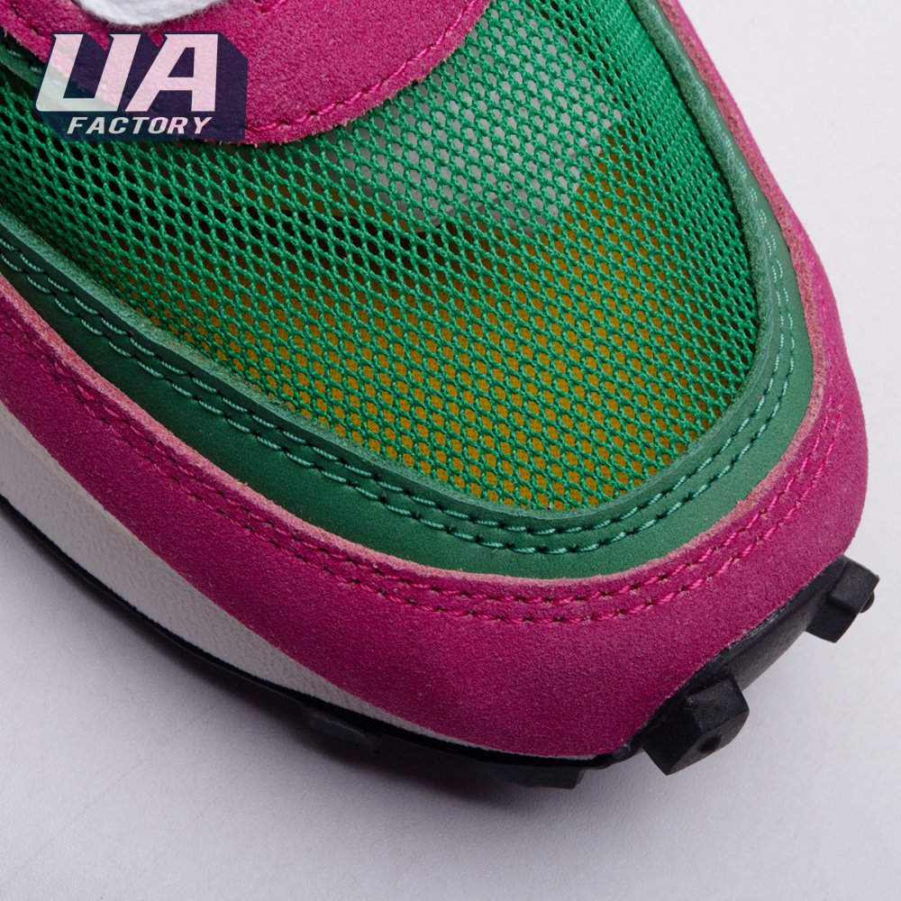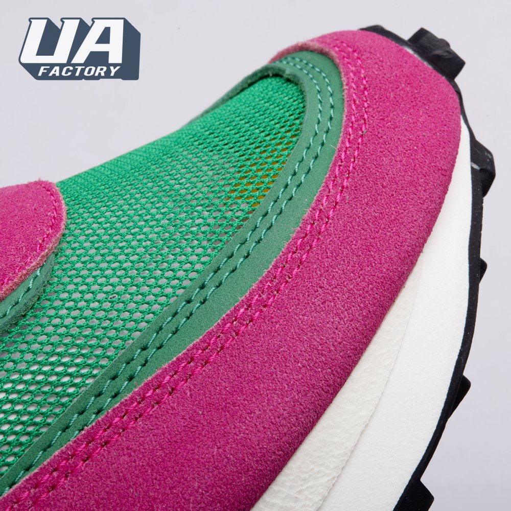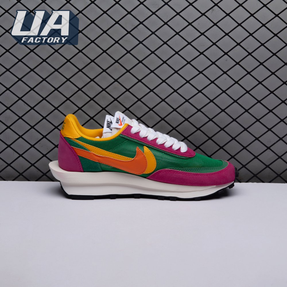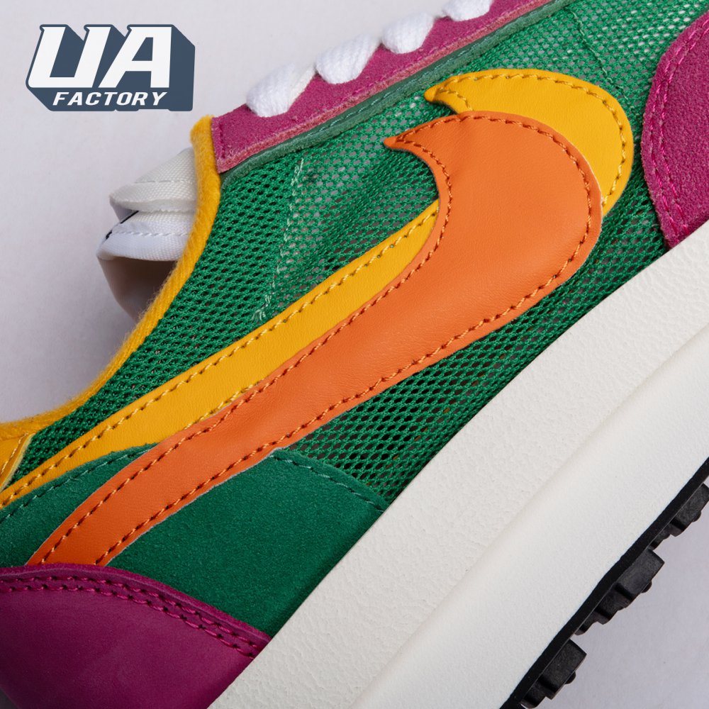 The Sacai x LDWaffle fuses the Japanese label's experimentalism with Nike's heritage ingenuity. Unveiled in September 2019, this 'Pine Green' edition updates the hybrid model in a vibrant color story. Its mesh upper sees layered suede eyestays, double reinforcements and dual, two-tone Swooshes. The aesthetic is furthered by twin tongues, optional double laces and stacked heel logos. Its double stacked, sculpted midsole follows the same formula atop a rubber waffle tread.