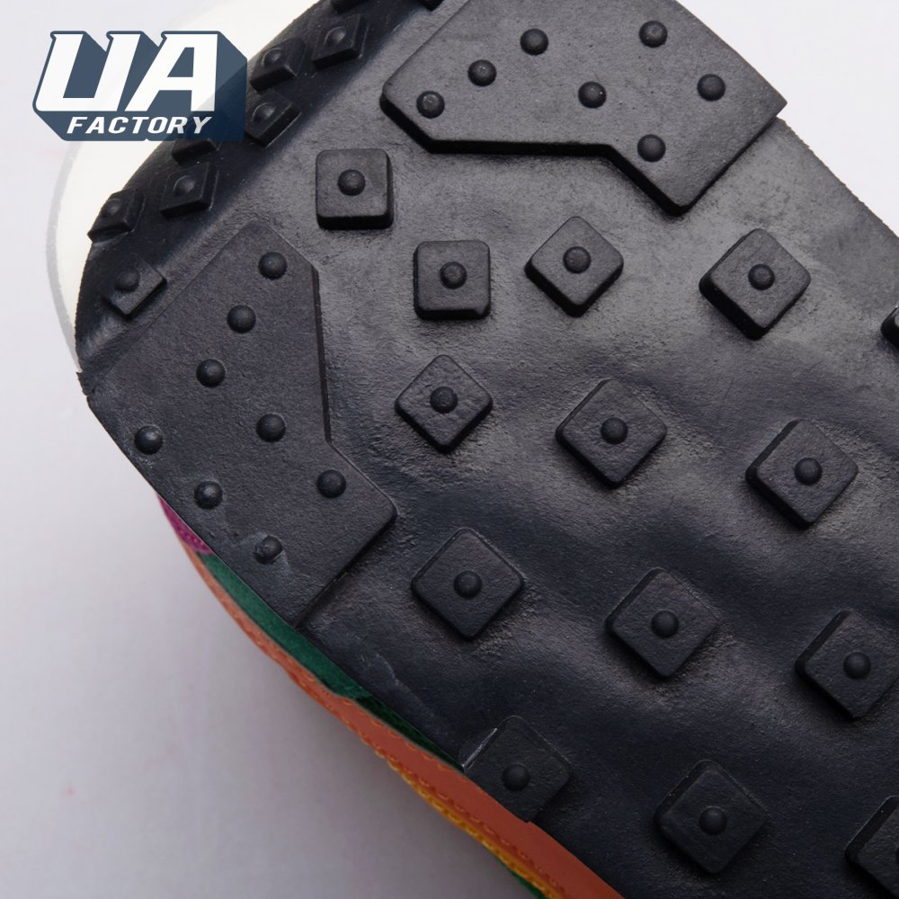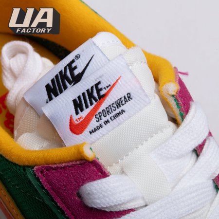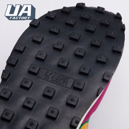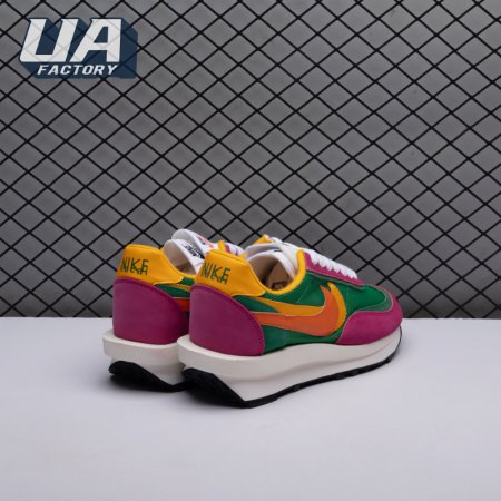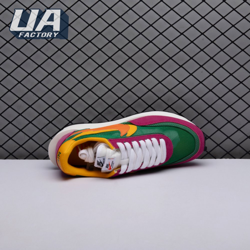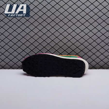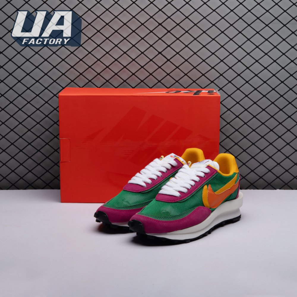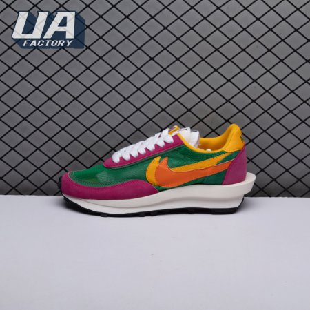 The Sacai x LDWaffle fuses the Japanese label's experimentalism with Nike's heritage ingenuity. Unveiled in September 2019, this 'Pine Green' edition updates the hybrid model in a vibrant color story. Its mesh upper sees layered suede eyestays, double reinforcements and dual, two-tone Swooshes. The aesthetic is furthered by twin tongues, optional double laces and stacked heel logos. Its double stacked, sculpted midsole follows the same formula atop a rubber waffle tread.